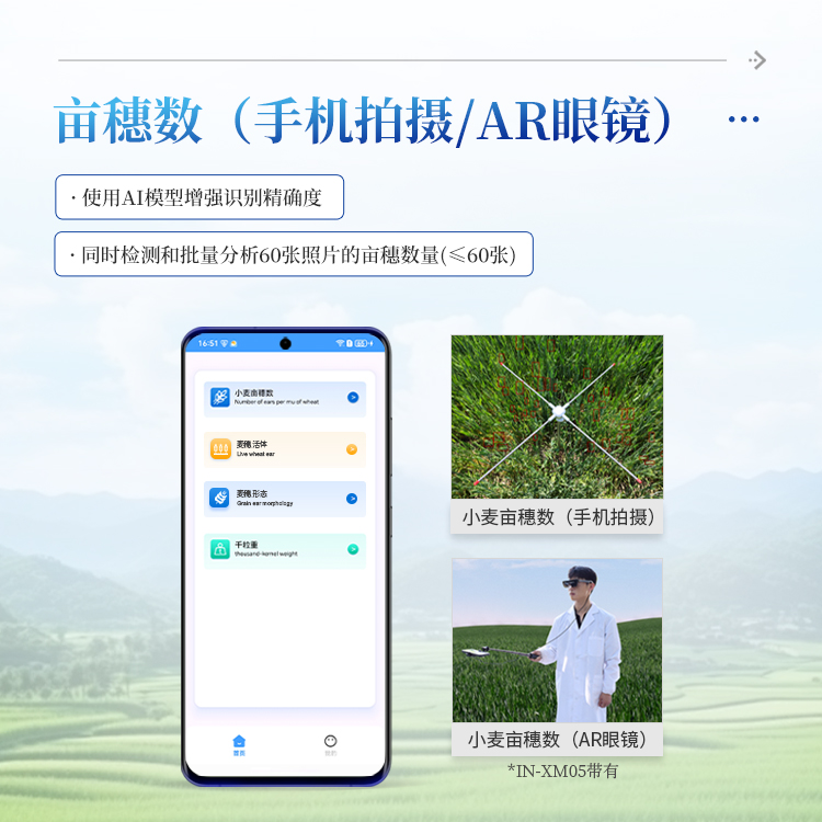 4)麦穗形态测定仪依托手机视觉技术,通过AI图像矫正算法一键获取穗长、小穗数等关键指标。全系统实现田间快速取样、批量分析及数据互联,为育种优化、产量预测和功能基因解析提供智能化解决方案。